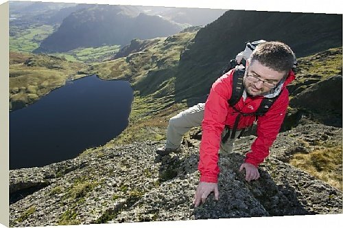 Box Canvas Print of A man scrambling on Pavey Ark in the Lake District UK from Specialist Stock Feature