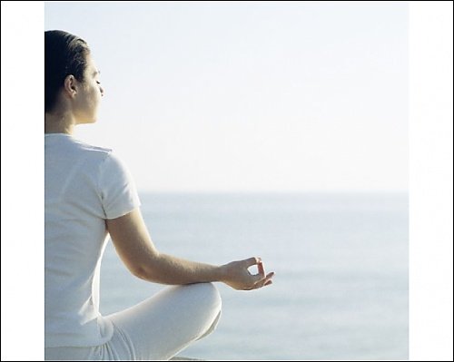 - Image Description: MODEL RELEASED. Yoga meditation. Womanmeditating in the lotus position, facing the sea.