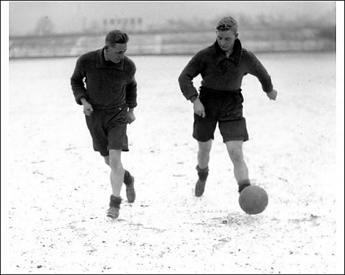 - Image Description: Bradford City FC. Taylor and Dickinson training in the snow.. 11th February 1930. DM17278.